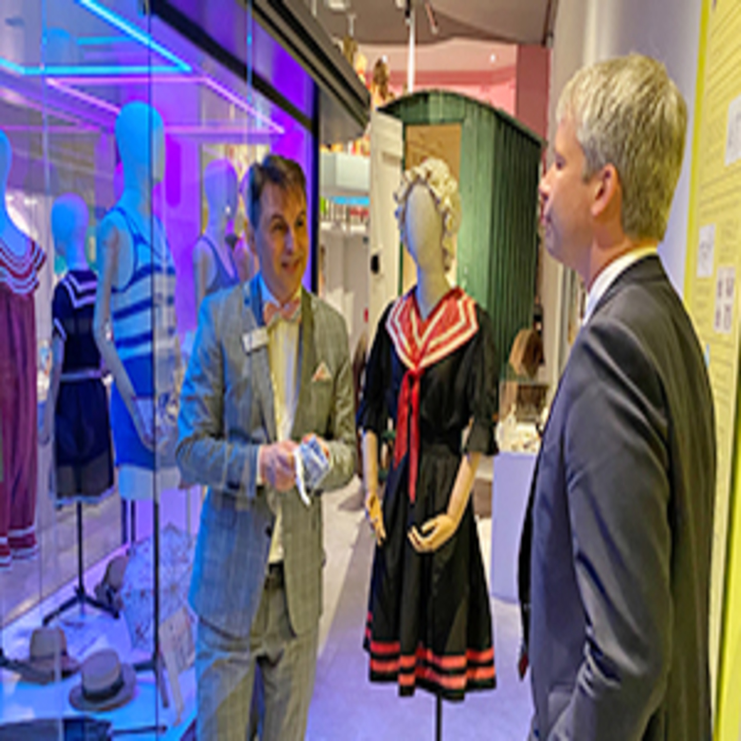 Auf mehr als 2000 Quadratmetern Ausstellungsfläche reisen die Gäste nun durch die Historie der Badebekleidung: von den Anfängen im 19. Jahrhundert über die Erfindung des Bikinis 1946, bis hin zur Gegenwart. Bilger wurde während seines Aufenthalts in der Kurstadt eine besondere Ehre zu teil. So durfte der gebürtige Schongauer ein neues Exponat, das pünktlich zum Besuch in Bonfeld eingetroffen war, in die historische Vitrine heben. „Wenn Sie so etwas öfter machen, sagen Sie Bescheid“, scherzte der 41-Jährige und packte sachte zu. Neu in der Ausstellung zu sehen ist nun ein Badekostüm aus der Zeit zwischen 1880 und 1900, erklärte Weinmann. „Es war eine angestrengte Suche. Für unsere Sammlung ist es besonders wertvoll“, betonte der Museumsdirektor, weil das Kostüm vollständig ist. Das heißt: Schuhe, Strümpfe, Pumphose, Kostüm und Badehaube sind alle beisammen. Auf dieses Kleidungsstück aufmerksam wurden die Museumsverantwortlichen nach einem Tipp von Kuratorin Ghislaine Rayer, mit der das BAM seit der ersten Planung eng zusammenarbeitet. Fündig wurden Weinmann und Ruscheinsky dann im US-amerikanischen New York. „Dort wurde es in einem Antiquitätenhandel zum Verkauf angeboten“, sagte Weinmann. „Wir sind glücklich und stolz, das nun gefunden zu haben.“ Nach den ersten Wochen zog der Museumsdirektor ein positives Zwischenfazit. Die Besucherzahlen stiegen kontinuierlich an und das Interesse - auch an Museumsführungen- sei groß. „Allesüber 100 Besucher am Tag sind ein absoluter Traum“, sagte Weinmann. „Am Donnerstag kamen 155 Gäste.“ Und auch der Staatssekretär zeigte sich von der Weltneuheit begeistert. Es sei beeindruckend, was aus privater Hand geschaffen worden sei. Er freue sich, dass trotz Corona viele Besucher ins Museum kämen.